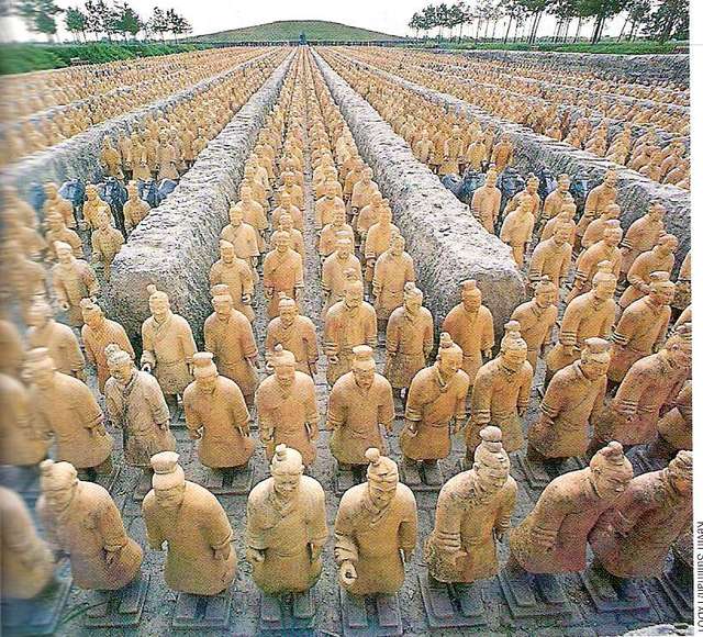 Strecha obrovského mauzólea sa krátko po cisárovej smrti zrútila pri rebélii vyvolanej jeho odporcami a tak pochovala pod sebou na tisícročia nielen cisárovu hrobku, ale i celý jeho hlinený sprievod. Každá hlinená postava vojaka je iná, osobitá, žiadna tvár sa neopakuje. Tento fakt vedie k domnienke, že sochy boli tvorené podľa skutočných postáv, živých modelov. Je motiváciou pre archeológov, reštaurátorov a umelcov vytvoriť kópie a repliky, zároveň dostatočným stimulom pre obchodníkov, aby vytvorili kopírujúce prostredie kdekoľvek na svete, kam budú viesť nohy návštevníkov. .