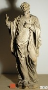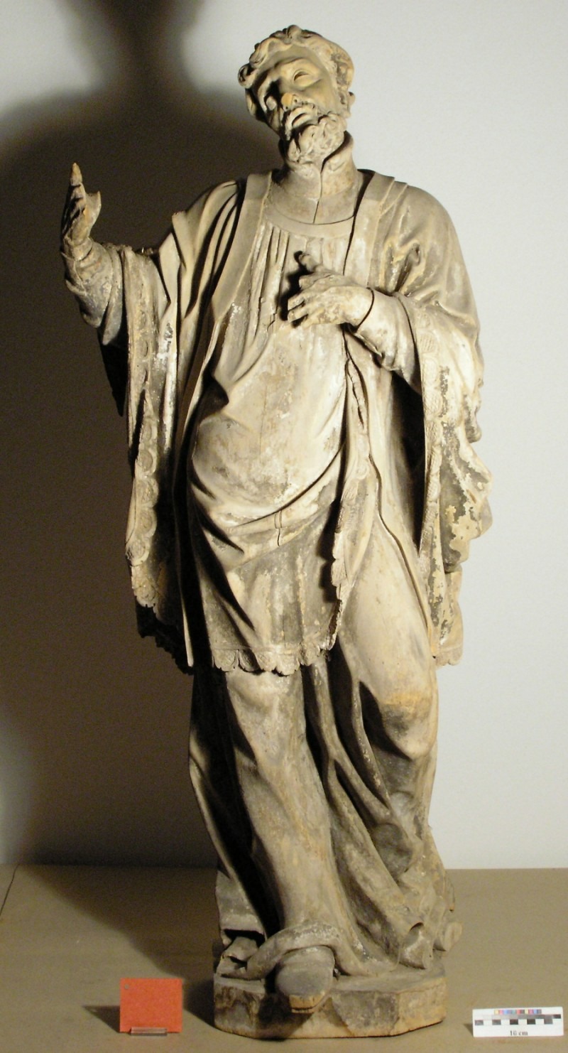 Setkal jsem se doposud jen s názorem na pravou z plastik, která by možná měla znázorňovat Sv.Františka z Assisi Serafinského (zakladatel františkánského řádu, 1182-1226). Napovídal by tomu atribut kříže – kontemplace (rozjímání) kříže. Tedy za předpokladu, že to co svírá, by měl být skutečně kříž.