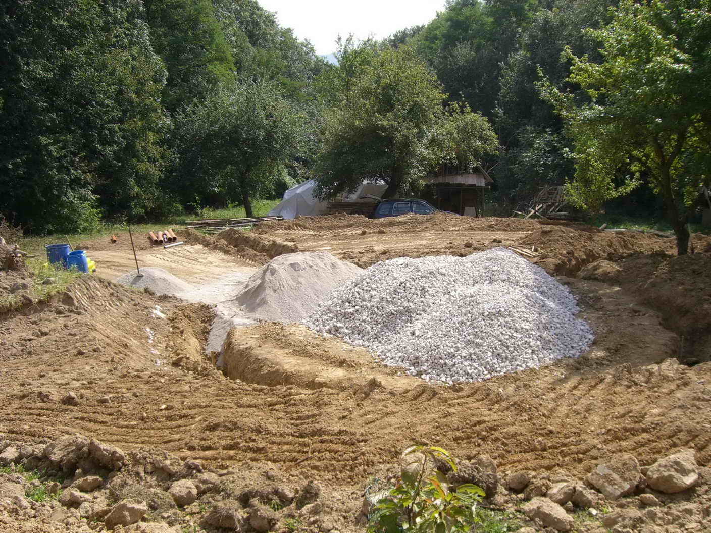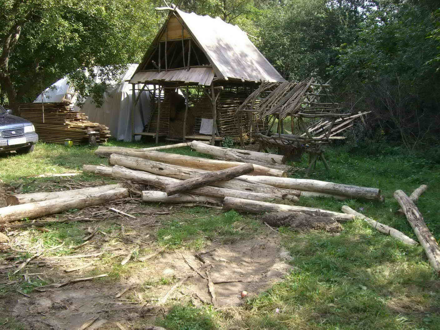 Teraz vraj miešajú hlinu s hrablami na hlinený špric pre slamnné balíky. Vraj maju 1/4 steny hotovú. A strecha je hotová po drevený záklop na trámoch. Prikrité je to dočasne plachtami. Fotky nemám lebo mi ich ada neposlala.
