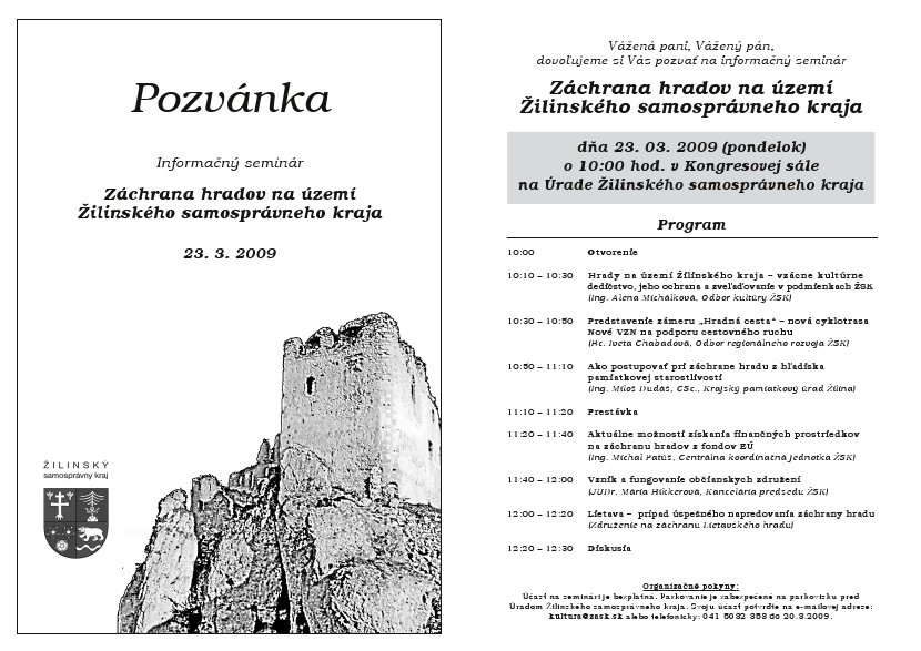 Posted by chobot on 22. marca 2009 at 18:42Žilinský samosprávny kraj organizuje informačný seminár na tému ZÁCHRANA HRADOV NA ÚZEMÍ ŽILINSKÉHO SAMOSPRÁVNEHO KRAJA, ktorého zámerom je oživiť a podporiť aktivity organizácií i jednotlivcov smerujúce k obnove alebo záchrane kultúrnych pamiatok v kraji. Seminár sa uskutoční dňa 23.3.2009 od 10.00 hod. na Úrade ŽSK v Žiline, v prílohe Vám zasielame pozvánku.