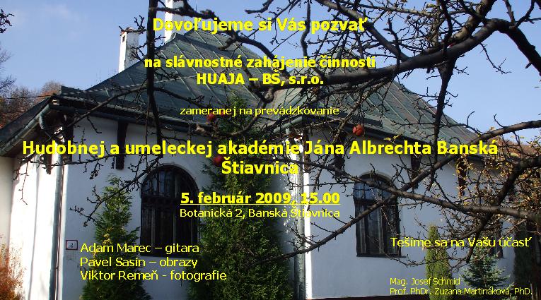 Posted by harp on 1. februára 2009 at 20:16Dovoľujeme si Vás pozvať na slávnostné zahájenie činnosti HUAJA – BŠ, s.r.o. zameranej na prevádzkovanie Hudobnej a umeleckej akadémie Jána Albrechta Banská Štiavnica 5. február 2009, 15.00