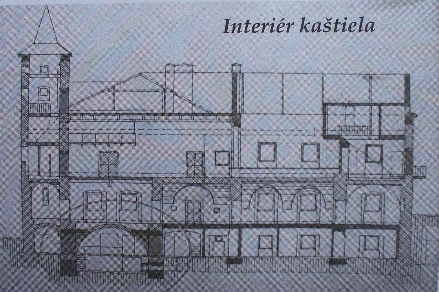 Kaštieľ bol trojpodlažná jednotraktová budova na nepravidelnom pôdoryse, na južnej strane polygonálny výstupok, na východnej strane pomerne vysoká veža so štvorcovým pôdorysom, situovaná do strednej osi budovy. Naľavo od veže bol menší plochý rizalit, zakončujúci východnú fasádu. V južnom krídle bola čierna kuchyňa a nad ňou reprezentačná sieň s krbom. V priestore veže, zaklenutej krížovou hrebienkovou klenbou, bola kaplnka. Miestnosti druhého podlažia boli zaklenuté okrem veľkej miestnosti na východnej strane, ktorá mala neskorogotický trámový strop s prievlakom. Klenby boli valené alebo krížové s hrebienkami a pochádzali z čias okolo roku 1600. Miestnosti na treťom podlaží mali drevené trámové stropy. V ústrednej sieni na treťom podlaží bol renesančný krb z farebných kachličiek zo 17. storočia. Do západného jednotraktového krídla boli sústredené reprezentačné priestory; v „súdnej sieni“ kamenný renesančný krb so starostlivo vypracovaným reliéfnym dekorom s rozvilinami, detskými hlavičkami a alegorickou postavou z čias medzi rokmi 1490-1510. Na dverách boli veľmi staré trámové zárubne, na prvom podlaží so zachovanými drevenými kladkami, ktoré slúžili v prípade nebezpečenstva na vytiahnutie podestovej dosky. V bývalej kaplnke zvyšok rokokového oltára s dvoma plastikami anjelov, z roku 1749.