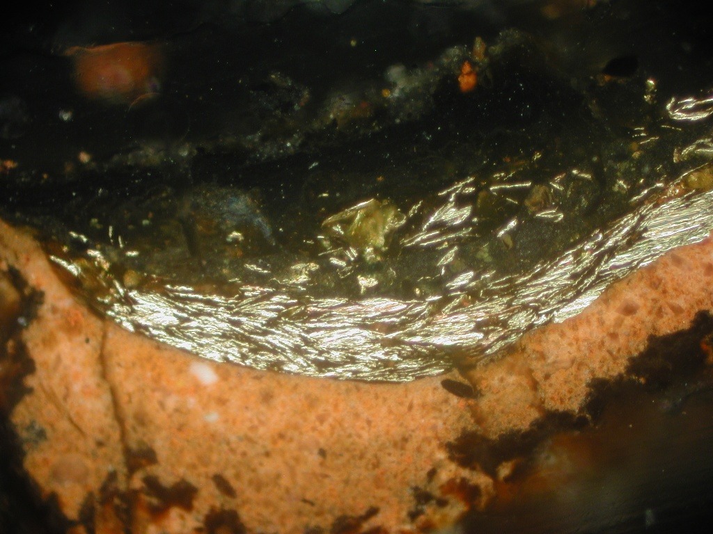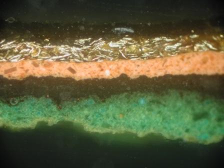 Pohledově se mi zdá, že se jedná zlaté šupinky v nějakém organickém pojivu nebo o tzv. mušlové zlato. Vzhledem k tloušťce, která je značná, si myslím, že se nejedná o plátkové zlato, ale možná se mýlím.