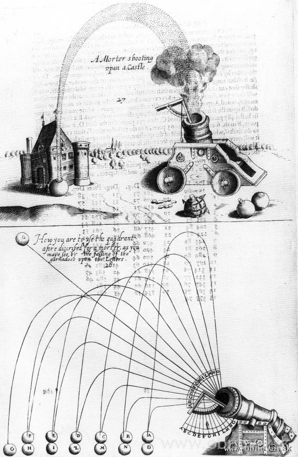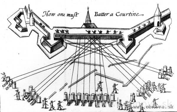 Obr. 22 a 23 Dobové anglické príručky pre ostreľovanie kurtín (1) a bastiónov (2) [Brice, M., 1999].
