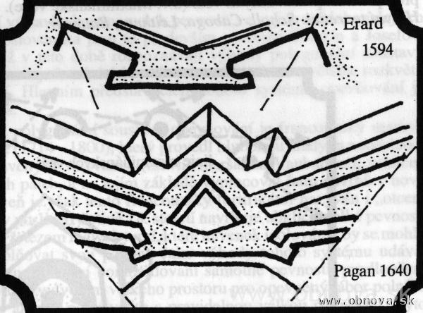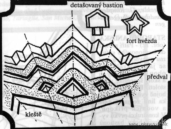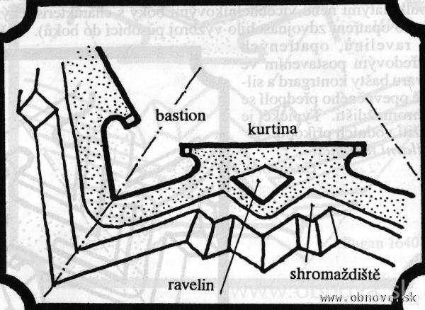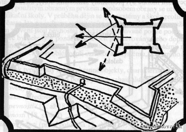 Obr. 17 Schematické znázornenie charakteristických riešení novotalianskej pevnostnej školy [Kupka, V., 1994] – vpravo.