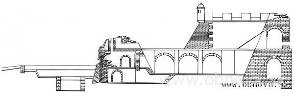 Obr. 13 Röntgenový rez starotalianskym bastiónom – za pozornosť stoja najmä vnútorné vystužujúce piliere v násype bastiónu [B. Zanchi, 1561].