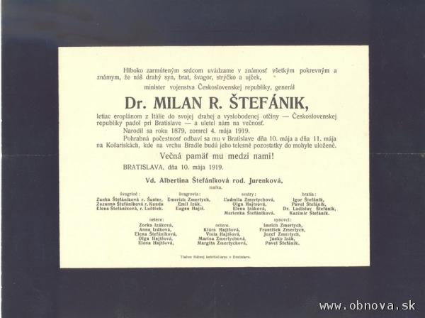 Astronóm a meteorológ, vojak, letec, generál, politik, diplomat, ale aj cestovateľ, fotograf, milovník poézie a klasickej literatúry 4. mája 1919 nastúpil na letisku Campoformido pri talianskom Udine do lietadla Caproni 450, ktorého cieľom cesty bolo letisko vo Vajnoroch pri Bratislave. Lietadlo však nepristálo, pretože sa náhle zrútilo neďaleko Ivanky pri Dunaji. Milan Rastislav Štefánik ako aj ďalší traja členovia posádky boli na mieste mŕtvi. Havária lietadla sa dodnes úplne nevysvetlila. Generál je pochovaný v mohyle na Bradle. Jeho tragická smrť vyvolala v slovenskej a česko-slovenskej verejnosti dovtedy nevídané reakcie, prvýkrát totiž národ v novovzniknutom štáte stratil jednu z vodcovských osobností, ktorá ho reprezentovala.
