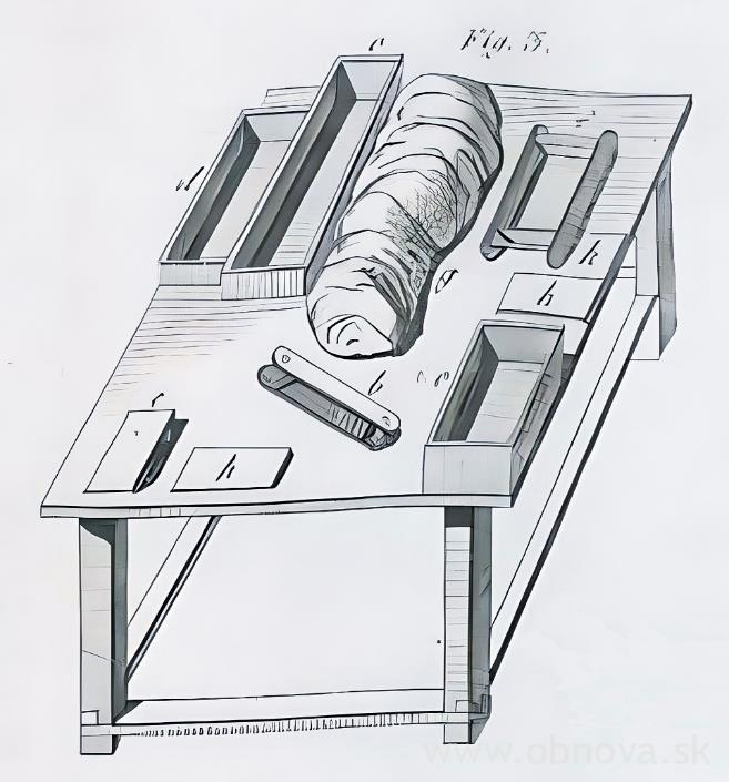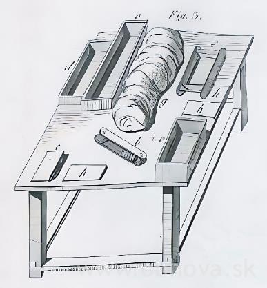 b. Stoly dlhé štyri, šesť, alebo dvanásť stôp (asi jeden a štvrť metra, jeden a trištvrte metra a vyše tri a pol metra). Čím je stôl dlhší, tým viac pracovníkov na ňom môže pracovať. Takýto stôl je zobrazený na ilustrácii Tafel V, Figur „3“.