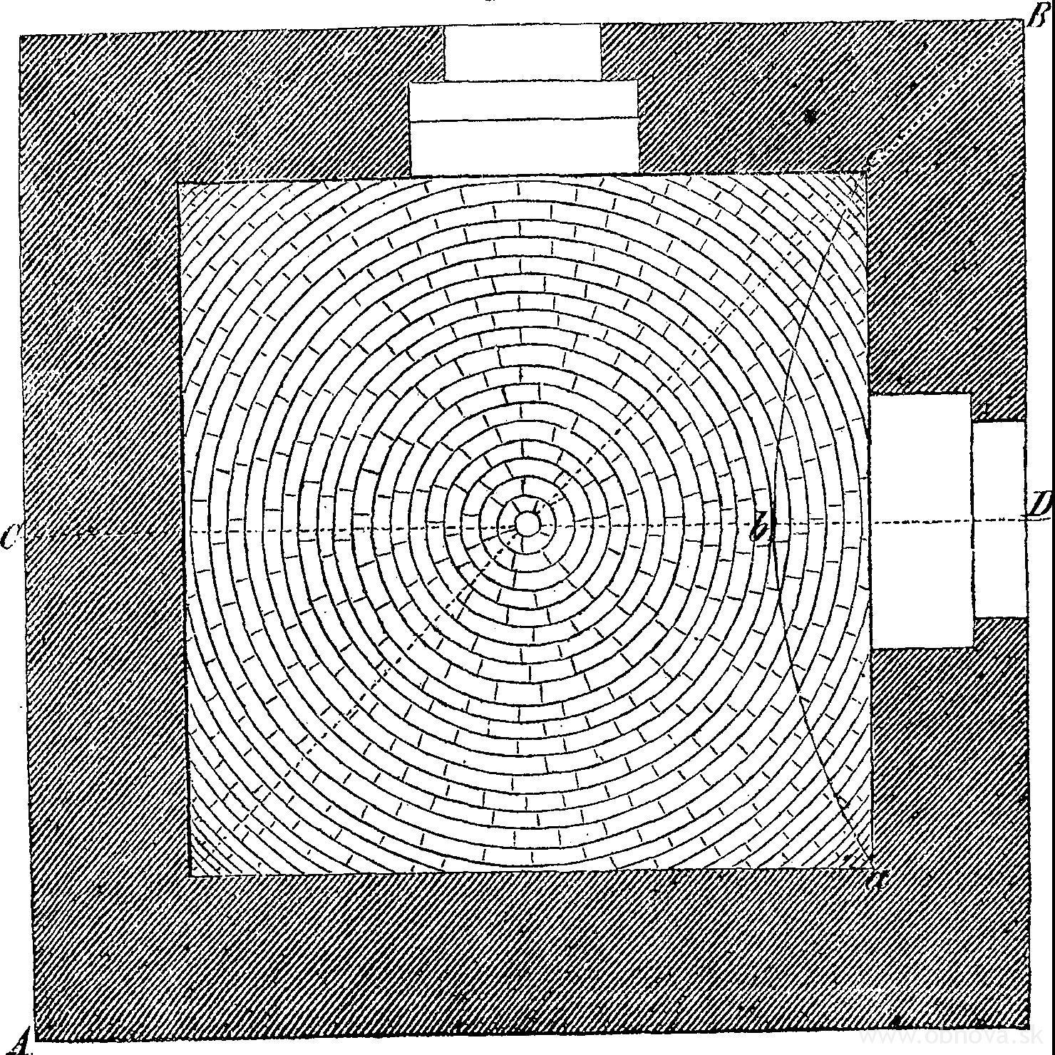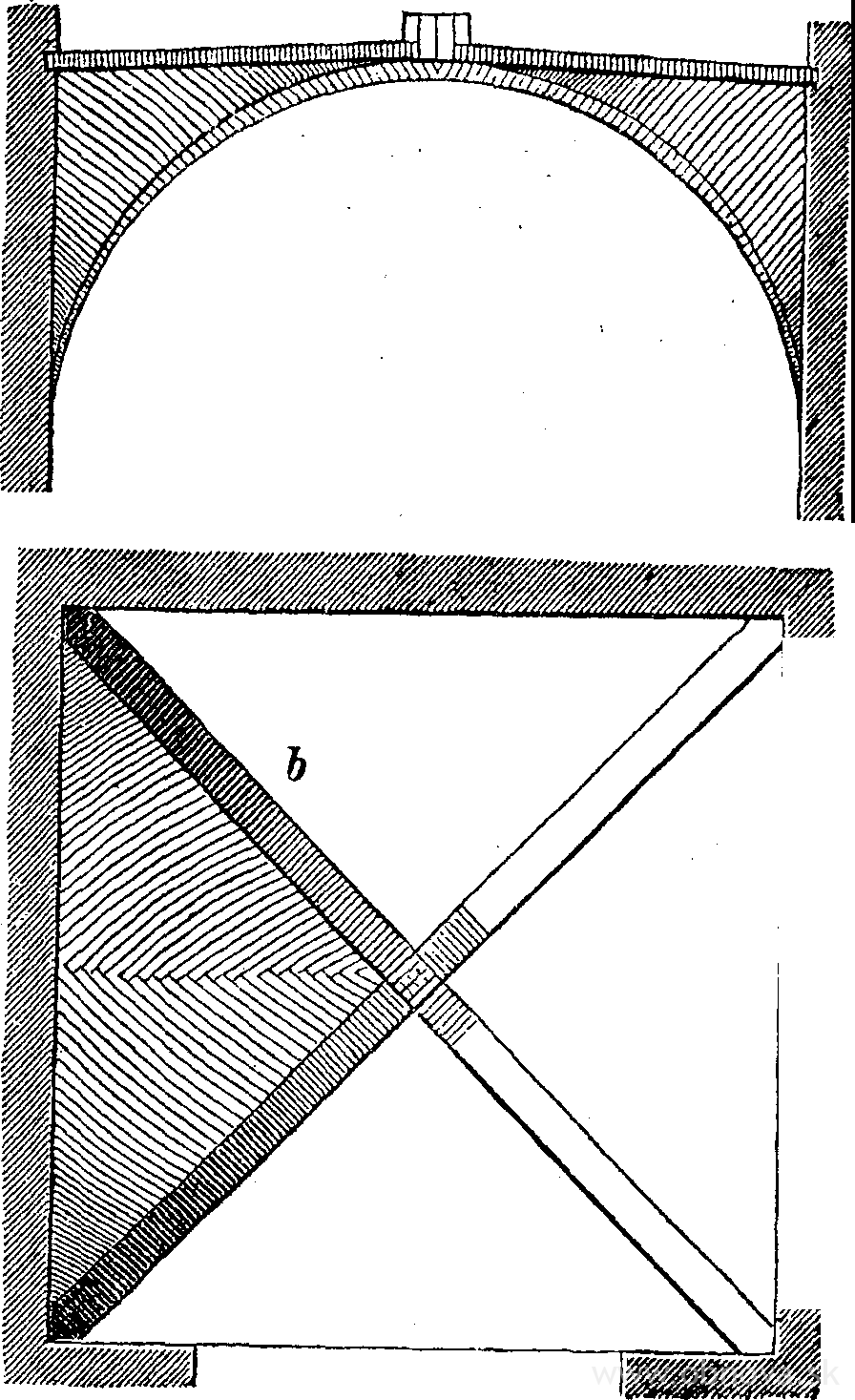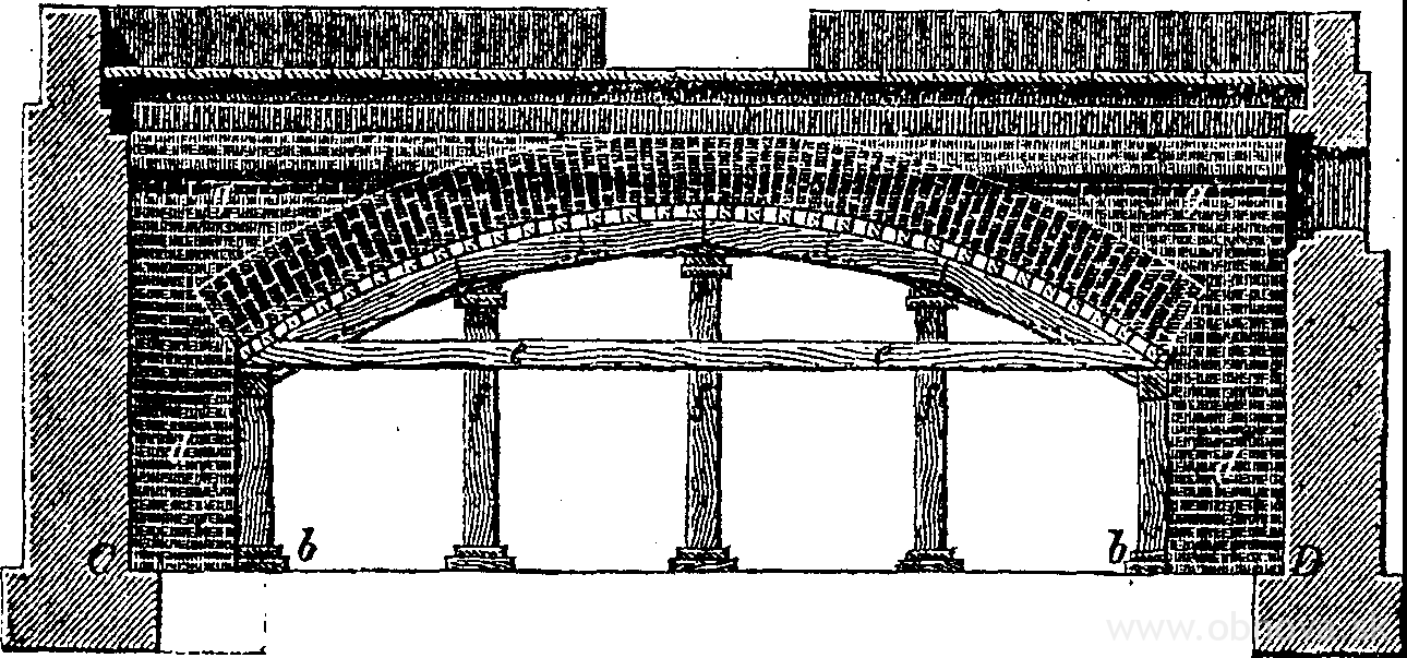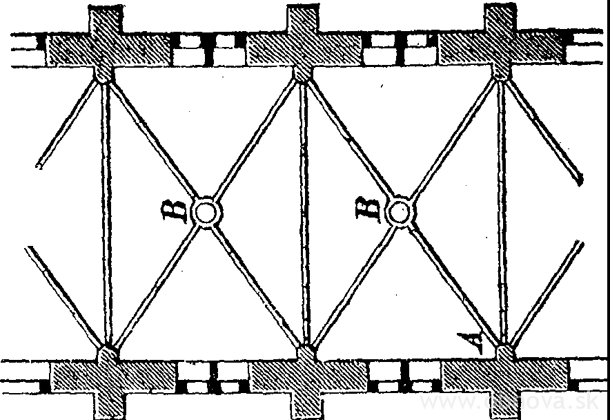 Ak je klenbovú skruž mosta možné podprieť zospodu tak ako je to zobrazené na ilustrácii Figur 47, tak je to je v každom prípade bezpečnejšie. Stojky sa v takomto prípade zatlčú do zeme a na tie sa položí rám, na ktorý sa priečne uložia trámy, ktoré sa pevne spoja s rámom a aj so stojkami. Na to sa položia spojovacie trámy, ktoré budú dlhé tak, aby to zodpovedalo rozporu pilierov mosta. Do trámov sa začapujú šikmé aj kolmé stojky, ktoré budú spojené priečne do nich upevnenými trámami. Na vrch celej konštrukcie sa uložia fošne podoprené priečnymi nosnými trámami. Na takto pripravenú konštrukciu je následne možne hneď murovať.