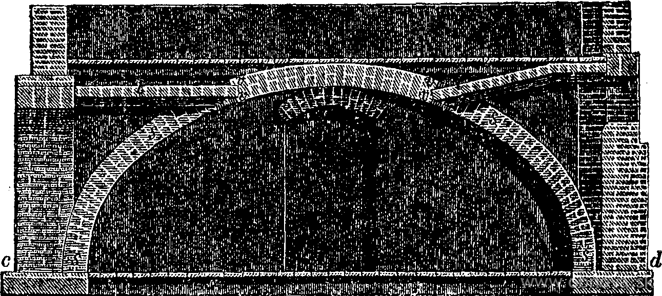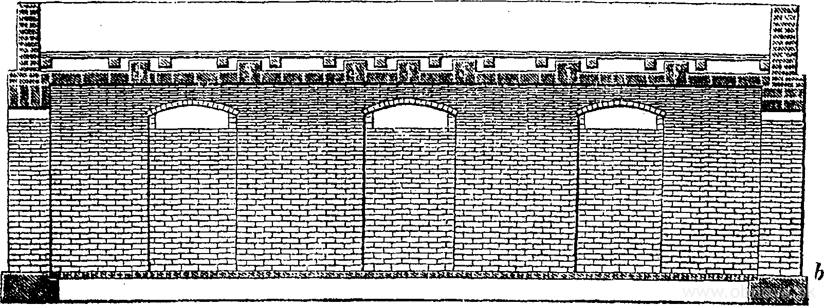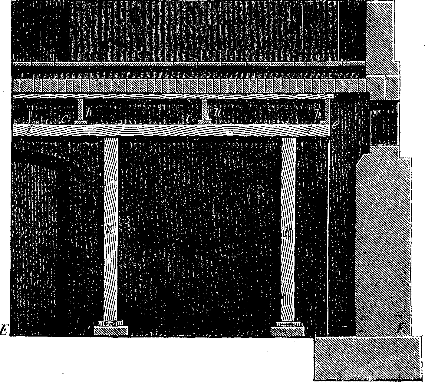 Ak je klenbovú skruž mosta možné podprieť zospodu tak ako je to zobrazené na ilustrácii Figur 47, tak je to je v každom prípade bezpečnejšie. Stojky sa v takomto prípade zatlčú do zeme a na tie sa položí rám, na ktorý sa priečne uložia trámy, ktoré sa pevne spoja s rámom a aj so stojkami. Na to sa položia spojovacie trámy, ktoré budú dlhé tak, aby to zodpovedalo rozporu pilierov mosta. Do trámov sa začapujú šikmé aj kolmé stojky, ktoré budú spojené priečne do nich upevnenými trámami. Na vrch celej konštrukcie sa uložia fošne podoprené priečnymi nosnými trámami. Na takto pripravenú konštrukciu je následne možne hneď murovať.