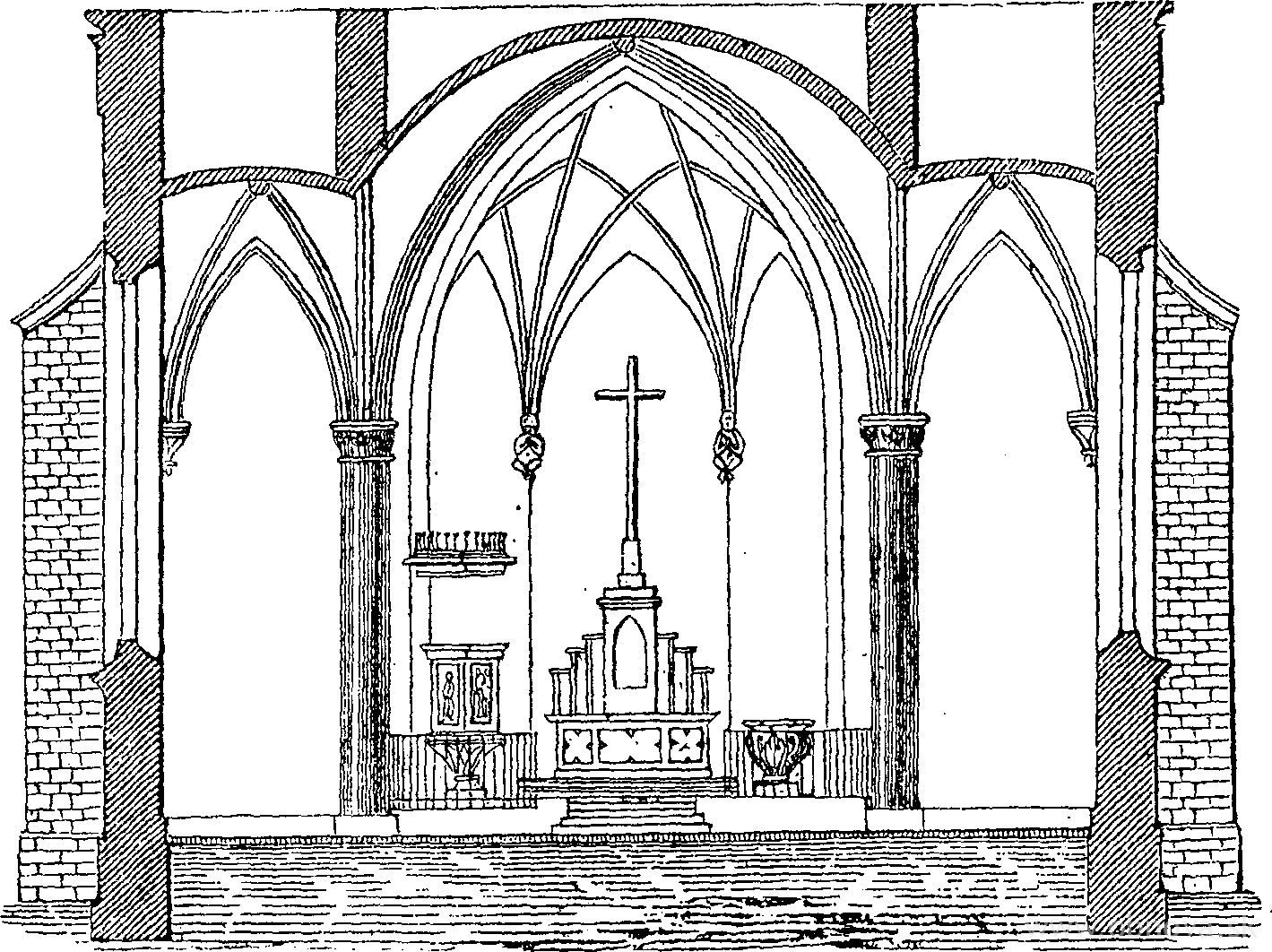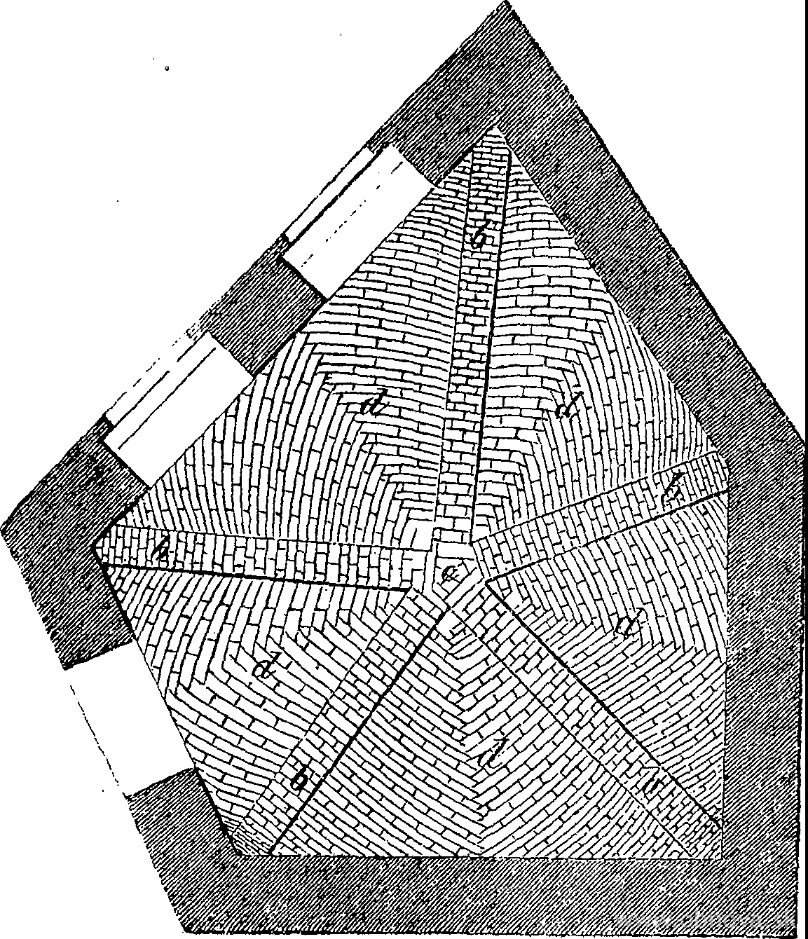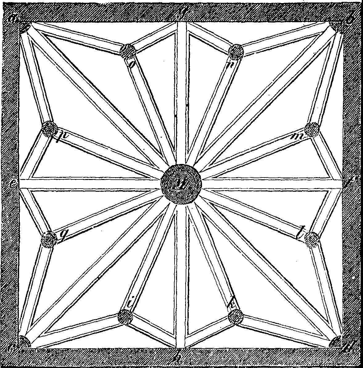 Ak je klenbovú skruž mosta možné podprieť zospodu tak ako je to zobrazené na ilustrácii Figur 47, tak je to je v každom prípade bezpečnejšie. Stojky sa v takomto prípade zatlčú do zeme a na tie sa položí rám, na ktorý sa priečne uložia trámy, ktoré sa pevne spoja s rámom a aj so stojkami. Na to sa položia spojovacie trámy, ktoré budú dlhé tak, aby to zodpovedalo rozporu pilierov mosta. Do trámov sa začapujú šikmé aj kolmé stojky, ktoré budú spojené priečne do nich upevnenými trámami. Na vrch celej konštrukcie sa uložia fošne podoprené priečnymi nosnými trámami. Na takto pripravenú konštrukciu je následne možne hneď murovať.